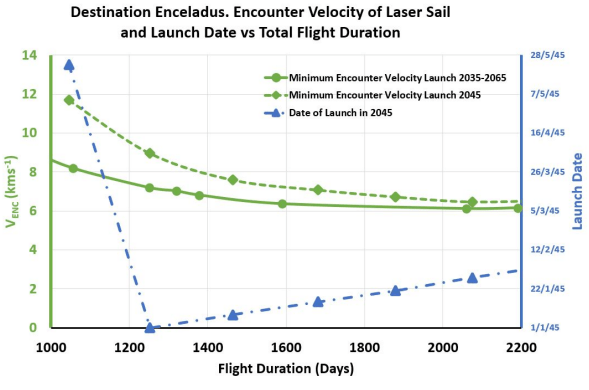 There are specific launch windows to reach Europa and Enceladus, according to the authors. The windows depend on where Earth and the target moons are but also on spacecraft velocity. And that depends partly on laser power.