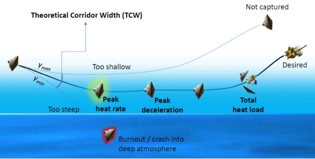 Another thing to consider is the entry corridor, which is the region of the atmosphere a spacecraft enters to reach its desired destination. The Theoretical Corridor Width (TCW) quantifies the width of the corridor, and must be large enough to accommodate a safe landing, accounting for atmospheric uncertainties, and also provide sufficient safety margin for mission success even in limiting scenarios, such as combination of shallow entry and thin atmosphere.