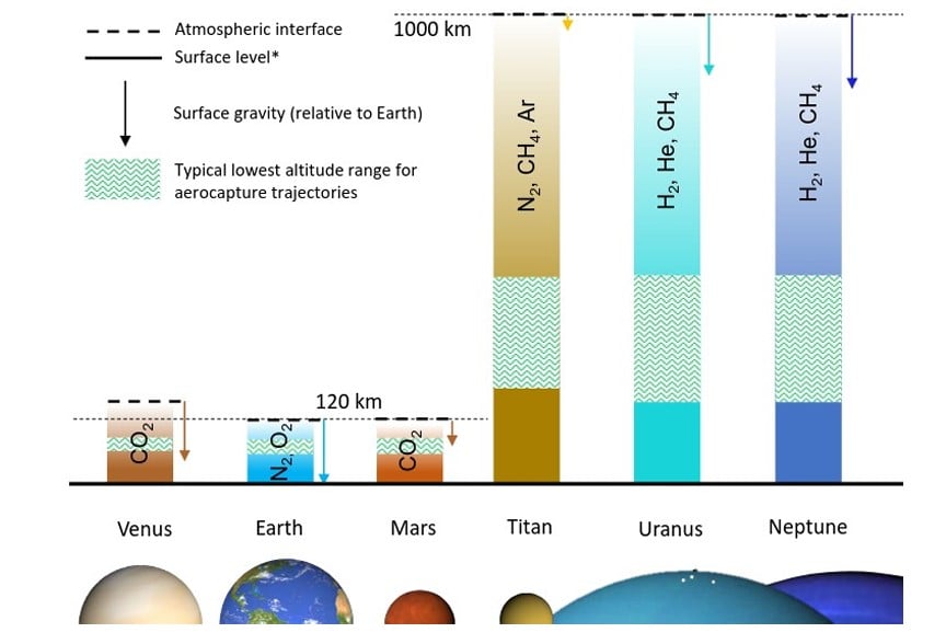 But there is great diversity in the physical structure and chemical composition of the atmospheric layers of the planets in our solar system, from the "hot thick Venusian CO2 atmosphere to the cold icy H2-He atmospheres of Uranus and Neptune," writes Girija, adding that measurements such as the noble gas abundances and isotopic ratios in these atmospheres are not only critical any aerobraking operations, but also to our understanding of the origin, formation, and evolution of the Solar System.