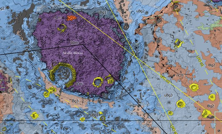 The map shows mound materials, different types of bedrock, features like Mensas and crater materials of different ages.