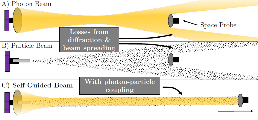 Recently, optics research has developed a way of combining particle and laser beams that all but eliminates diffraction and beam spreading when both are used simultaneously. This would allow a beamed propulsion system to continue concentrating its beam on exactly the right place without slowly losing its pushing force as the probe gets further away. Dr. Limbach used this underlying technology to develop what he calls PROCSIMA, a novel propulsion method that used a coherent combined particle and laser beamed propulsion system.