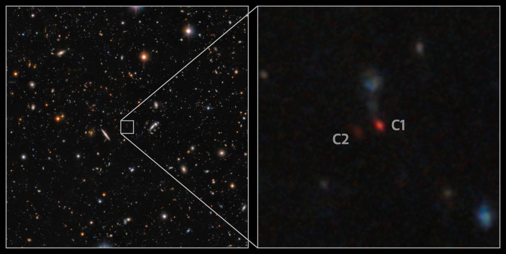 Subaru/Hyper Suprime-Cam discovered the pair of dim galaxies earlier this year with help from the Gemini North Telescope. Yoshiki Matsuoka, at Ehime University in Japan, was looking over images taken by the Subaru Telescope and noticed a faint patch of red. "While screening images of quasar candidates I noticed two similarly and extremely red sources next to each other," says Matsuoka, "The discovery was purely serendipitous."