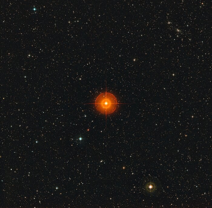 Red giant stars are what become of main sequence stars like our Sun once they have exhausted their hydrogen fuel, and they expand to becomes hundreds the size of times their normal diameter. Since R Doradus has a mass similar to that of our Sun, this red giant star is likely a good example of how our Sun will look like in approximately five billion years.
