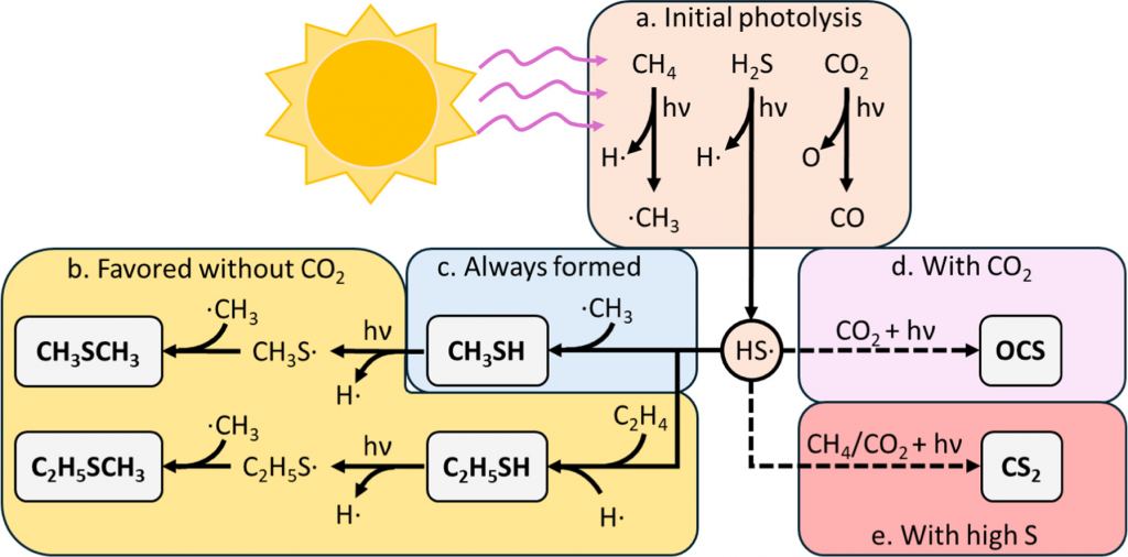 Reference: Reed, Nathan W., et al. " Abiotic Production of Dimethyl Sulfide, Carbonyl Sulfide, and Other Organosulfur Gases via Photochemistry: Implications for Biosignatures and Metabolic Potential." *The Astrophysical Journal Letters* 973.2 (2024): L38.