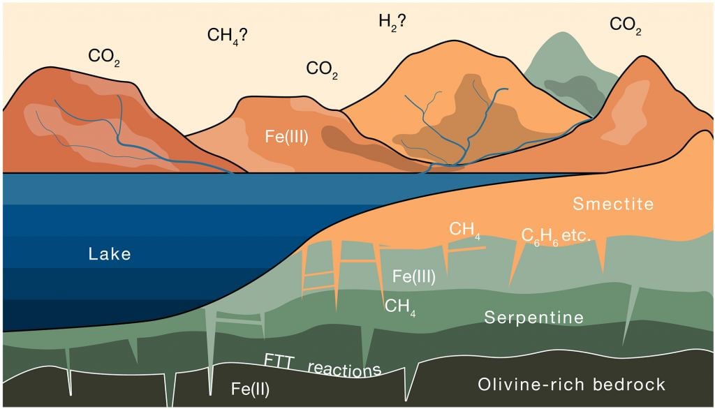 The challenge was to figure out how so much smectite formed on Mars. Rather than uplifting tectonic plates it is a series of chemical reactions. The authors suggest that water on Mars seeped through olivine, a magnesium iron silicate common on Earth, Mars, and even asteroids. The iron in olivine would bind with the water's oxygen and release hydrogen. This hydrogen would then react with carbon dioxide to form methane. Over time this process would transform the olivine into smectite, which would trap methane and carbon dioxide. Based on their calculations the team argues that 80% of the ancient atmosphere is now trapped in the Martian clay, leaving the thin atmosphere we see today.