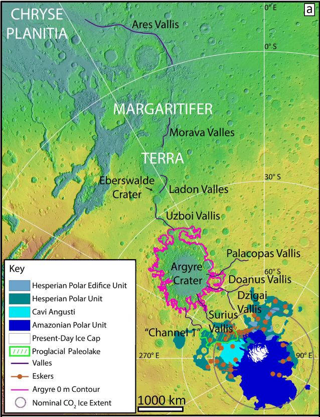 In Earth's frigid climates, rivers can flow underneath thick, protective ice sheets. New research shows that a similar thing happened on Mars. The research is published in JGR Planets and is titled " Massive Ice Sheet Basal Melting Triggered by Atmospheric Collapse on Mars, Leading to Formation of an Overtopped, Ice-Covered Argyre Basin Paleolake Fed by 1,000-km Rivers." The lead author is Peter Buhler, a Research Scientist at the Planetary Science Institute.