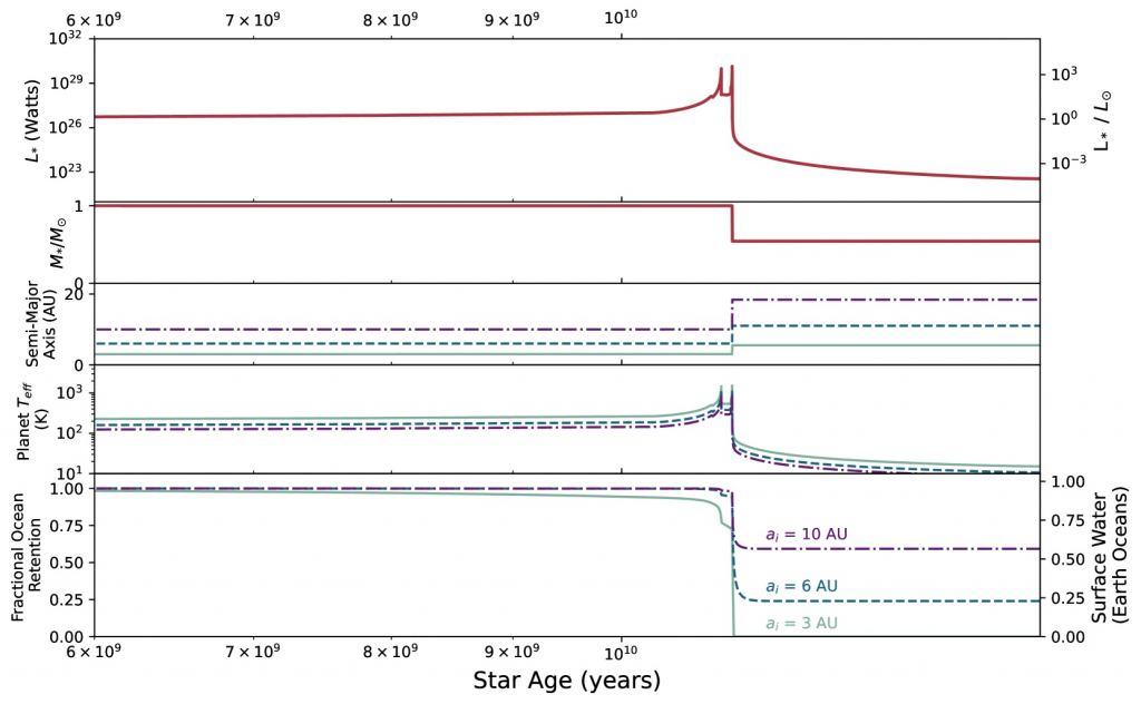 The second critical stage is orbital migration. Once the star becomes a white dwarf, an ocean world at Saturn's orbit would be an ice planet far beyond the habitable zone. To become a living world, it would need to move inward to a close, warm orbit. This is possible both through interaction with the nebula formed during the red giant stage, as well as through gravitational interactions between planets. Our own solar system, for example, had a migration phase in its youth. As the study shows, however, the timing of this migration is critical. If the inward migration of a world happens too soon, then much of the water will boil off. If it happens too late, then the system will have stabilized to the point that the world won't be able to enter the habitable zone.