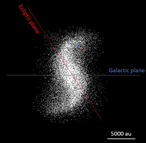 According to their model, the Oort cloud looks like a spiral disk about 15,000 au across, offset by the ecliptic by about 30 degrees. But more interestingly, it has two spiral arms that almost make it look like a galaxy.