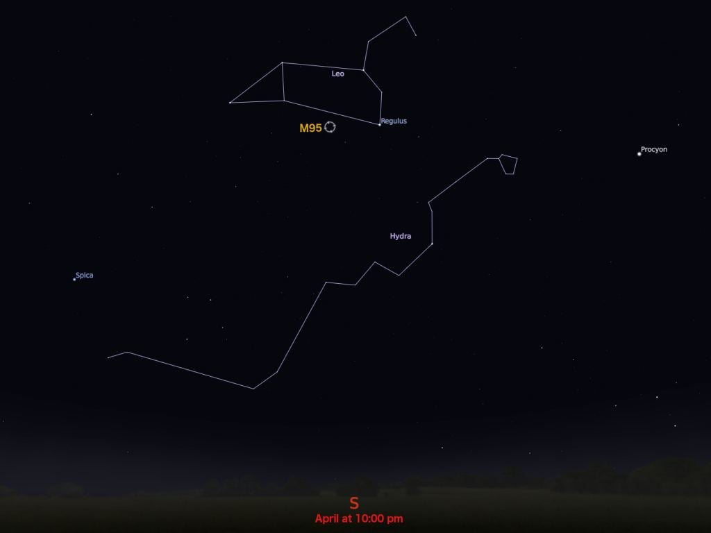 M95 is the southernmost in the widefield eyepiece pairing of galaxies which includes M96. With good sky conditions, both M95 and M96 are easy to locate in the belly of the constellation of Leo. Begin by identifying Alpha (Regulus), the brightest, southernmost star in the backward question mark asterism. Look about a fist-width west where you will see the shallow triangle asterism that marks Leo's hips. The westernmost of these stars (Theta) is your next marker. Look between the two markers for a faint star in an almost central position.