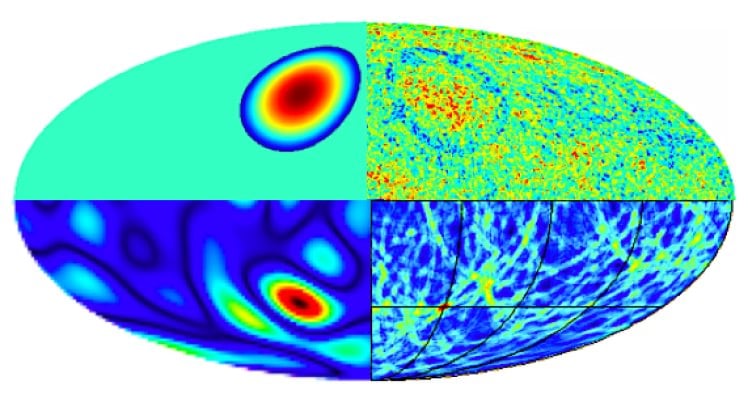 [caption id="" align="alignnone" width="550" caption="The signatures of a bubble collision at various stages in our analysis pipeline. A collision (top left) induces a temperature modulation in the CMB temperature map (top right). The "blob" associated with the collision is identied by a large needlet response (bottom left), and the presence of an edge is determined by a large response from the edge detection algorithm (bottom right). (Feeny, et al.)"]