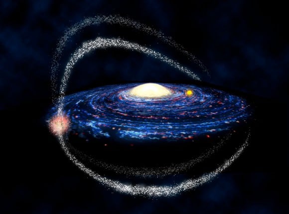 [caption id="attachment_91530" align="aligncenter" width="580" caption="An artist's impression of the four tails of the Sagittarius Dwarf Galaxy (the orange clump on the left of the image) orbiting the Milky Way. The bright yellow circle to the right of the galaxy's center is our Sun (not to scale). Image credit: Amanda Smith (University of Cambridge)"]