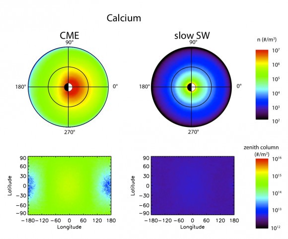 [caption id="attachment_91665" align="aligncenter" width="580" caption="Images from computer simulations of the lunar calcium exosphere during a CME (left) and the slow solar wind (right). Red and yellow indicate a relatively high abundance of calcium atoms while blue, purple, and black indicate a low abundance. The CME produces a much denser exosphere than the slow solar wind. Image Credit: NASA / Johns Hopkins University"]