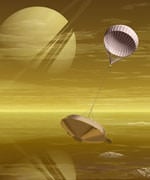 Image credit: ESA When the European Huygens probe on the Cassini space mission parachutes down through the opaque smoggy atmosphere of Saturn's moon Titan early next year, it may find itself splashing into a sea of liquid hydrocarbons. In what is probably the first piece of "extraterrestrial oceanography" ever carried out, Dr Nadeem Ghafoor of Surrey Satellite Technology and Professor John Zarnecki of the Open University, with Drs Meric Srokecz and Peter Challenor of the Southampton Oceanography Centre, calculated how any seas on Titan would compare with Earth's oceans. Their results predict that waves driven by the wind would be up to 7 times higher but would move more slowly and be much farther apart. Dr Ghafoor will present their findings at the RAS National Astronomy Meeting at the Open University on Wednesday 31 March.