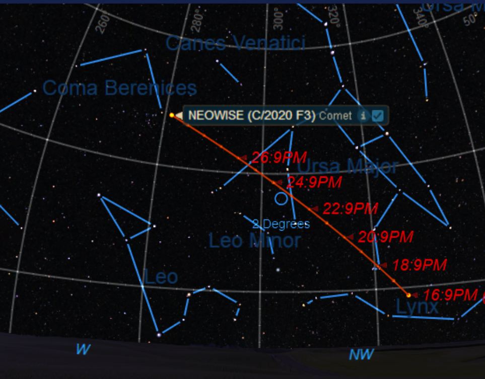 Now, the celestial stage is set for Act 2. Already, comet F3 NEOWISE is circumpolar (above the horizon all night) as seen from north of latitude 45 degrees. It's now getting better to see at dusk low to the northwest as it slinks across the constellation of the Lynx and into the paws of the Great Bear Ursa Major, retracing the footsteps of the asterism known as the 'Three Leaps of the Gazelle.'