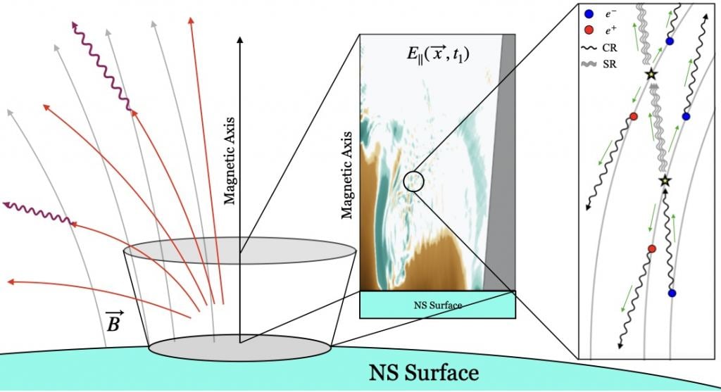This new study proposes a way we might be able to detect the remnant glow of axions. If they exist, axions could be produced in extremely strong magnetic fields, such as those around neutron stars and black holes. The strongest electromagnetic fields are around pulsars, so that would be the best place to look. Pulsars are neutron stars that generate powerful streams of energy from their magnetic poles. The polar regions would also produce vast quantities of axions, some of which would decay into light. So in theory pulsar light should contain the light of axion decay.