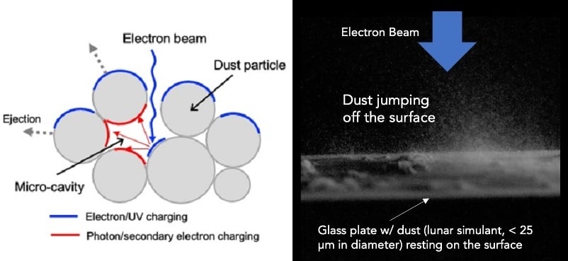 The way it works is simple, yet elegant. When an electron beam or UV field is applied to micro-cavities (which naturally form in a pile of dust) it causes a substantial negative charge to build on the surface of the dust particles. The repulsive force between these negatively charged particles eventually reaches the point where it causes them to eject them from the surface they were clinging to.