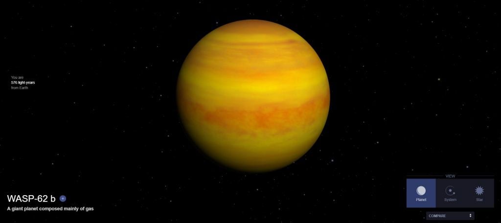 WASP-62b is the nearest planet to WASP-62, a main-sequence star almost 600 light-years from Earth. 62b is the only planet in the system. It's just over half as massive as Jupiter, and orbits WASP-62 in about 4.5 days. It's about 1.4 times as large as Jupiter. It falls squarely into the category of Hot Jupiters, with an average temperature of about 1330 K (1057 C; 1934 F.)