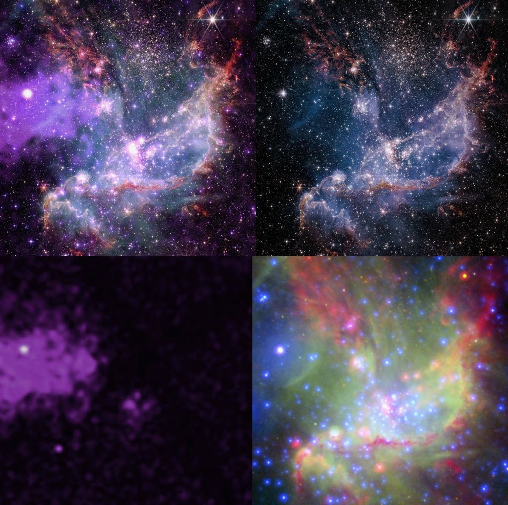 New images that combine data from NASA's Chandra X-ray Observatory* and the James Webb Space Telescope* (JWST) JWST have just been released! The images feature four iconic astronomical objects, showcasing the capabilities of these observatories by combining light in the visible, infrared, and X-ray wavelengths. These include the NGC 346 star cluster located in the Small Magellanic Cloud (SMC), the NGC 1672 spiral galaxy, the Eagle Nebula (Messier 16, or M16), and the spiral galaxy Messier 74 (aka. the Phantom Galaxy).