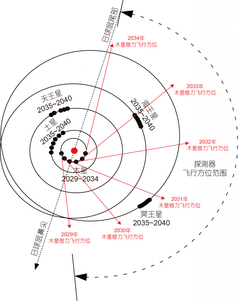 Another consideration was that given the distances involved (an average of 30 AUs from the Sun) and the carrying capacity of a mission to deep space, the probe's flight speed should be increased as much as possible during the early stage. They further concluded that the best way to do this (and decelerate to achieve an orbit around Neptune) was to conduct a launch around 2030, which would allow for a gravity assist with Jupiter and an arrival date of 2036. Other launch opportunities include 2028, 2031, and 2034, but any flights would need to arrive at Neptune before 2040.