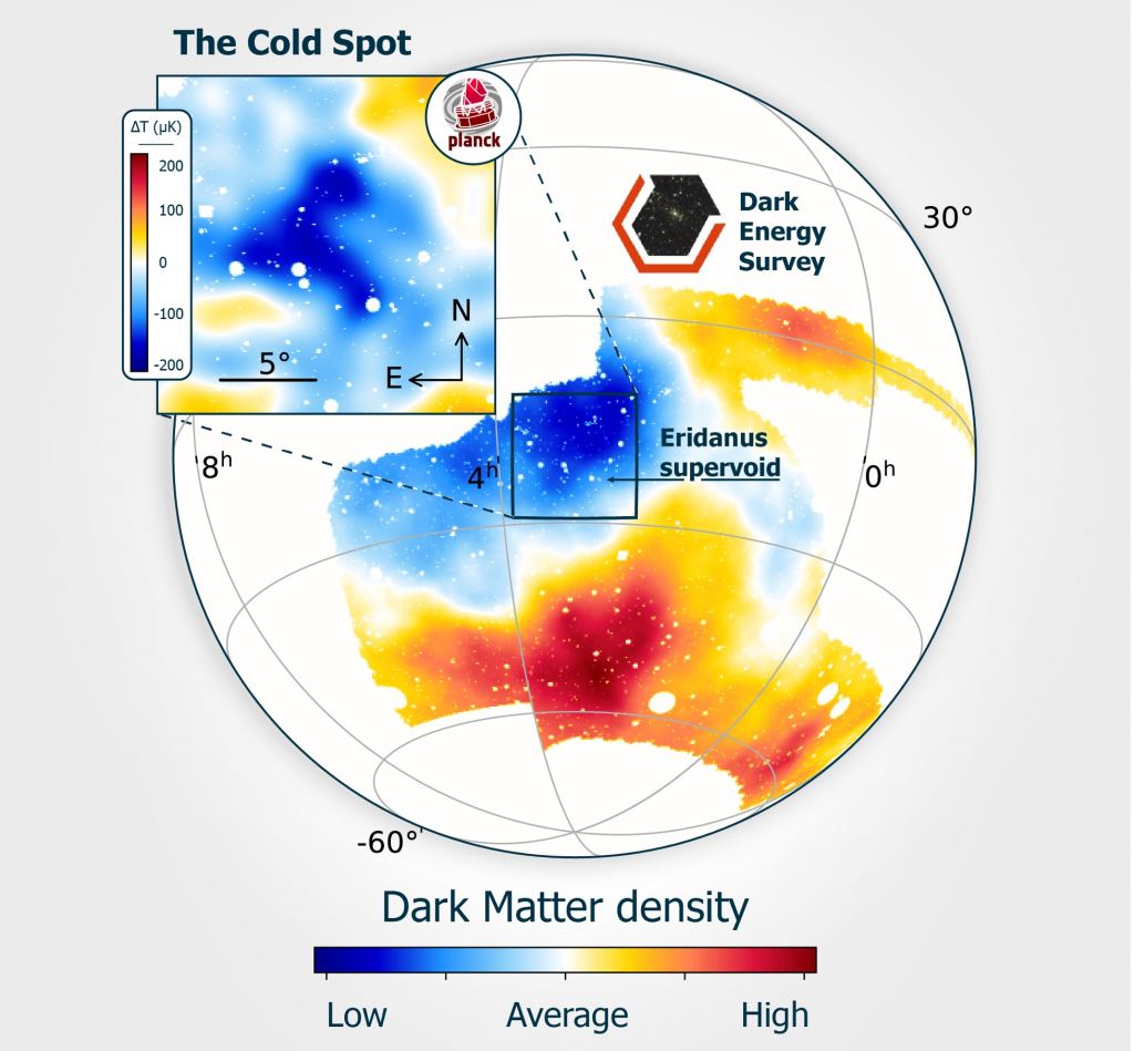 Located 1.8 billion light-years away in the constellation Eridanus, the Eridanus Supervoid was a theorized underdensity where matter concentrations were 30% less than the surrounding galactic region. The center of this void is located 2 billion light-years from Earth, making it the dominant underdensity in our galactic neighborhood. Using data collected by the Dark Energy Survey (DES), the team created a map of Dark Matter (DM) in the same direction as the CMB Cold Spot.