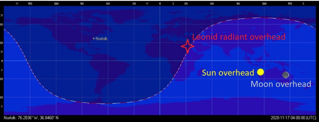 Unfortunately, 2020 is not projected to be such a year, but it's always worth keeping an eye out during the early morning hours in mid-November. The 2020 peak for the Leonids is expected to arrive on Tuesday, November 17th, at around ~4:00 Universal Time (UT) or 11:00 PM EST (on the 16th). The Moon is a waxing crescent just two days after New at this point, ideal for meteor watching. This also favors the longitude of Europe and Africa at dawn, another plus. The 2020 Zenithal Hourly Rate (ZHR) is expected to hit a moderate 15-20 meteors per hour.