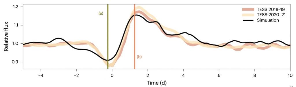 The first is that during the nearest part of their orbit, some of the atmospheric material from the large star is captured by the smaller one. Many close binaries can exchange matter, but what is unusual in this case is that the exchange triggers oscillations in the primary star. As the companion swings by, waves form on the surface of the primary star. These waves then cascade along the surface. The primary star rotates on its axis with a period of four days, so we see the waves pass along the star every few days. This explains the wobbling decay of the light curve.