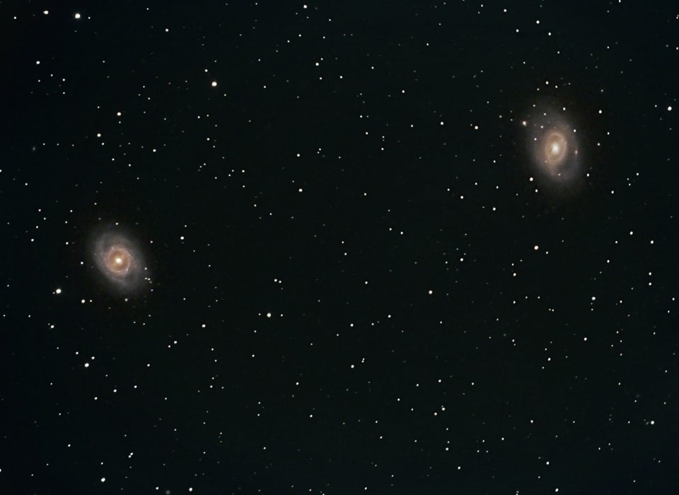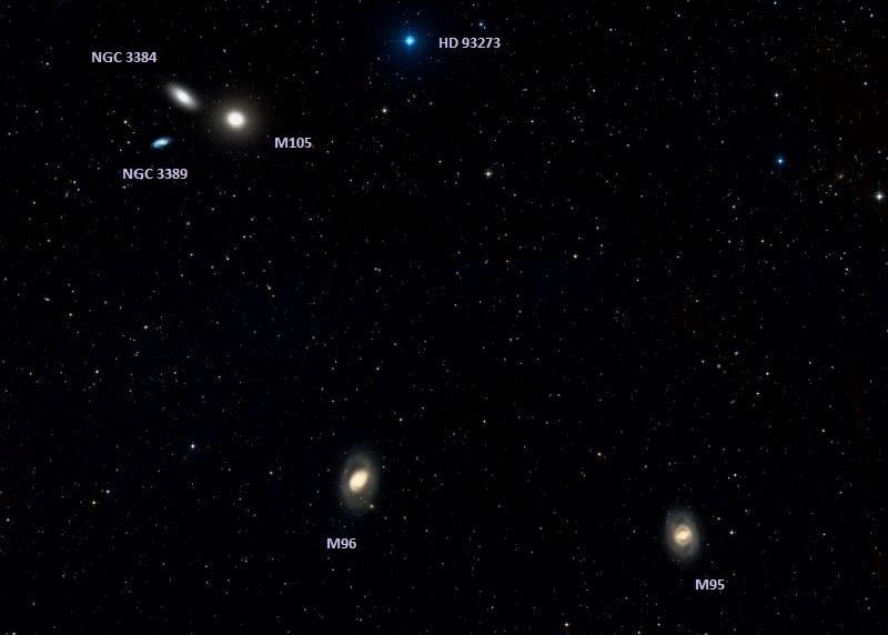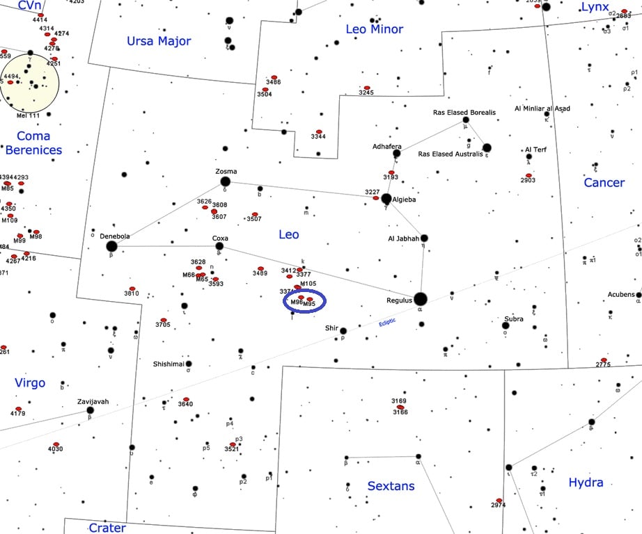 Look between the two markers for a faint star in an almost central position. If the skies are right to see this galactic pair, you will also see another star just south of your last marker. M95 and M96 are between these last two stars, and it is the northernmost and brighter of the two. The pair can just barely be seen in larger binoculars and although they are faint, perceivable in a small telescope. A larger aperture will bring out far more details.