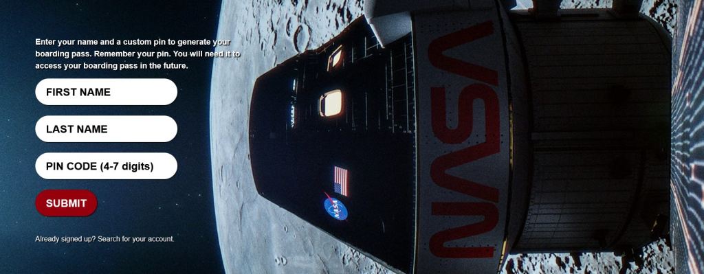 The sign-up process is easy: go to this link on NASA's website, and click on the "Get boarding pass." Users will be directed to fill in their first and last name, along with a 4-7 digit pin code. A "boarding pass" will be displayed with your name, which you can save, or you can access it again later by remembering your pin code. After submitting, NASA will send a QR code to allow those who sign up to join future NASA launches by watching online. T