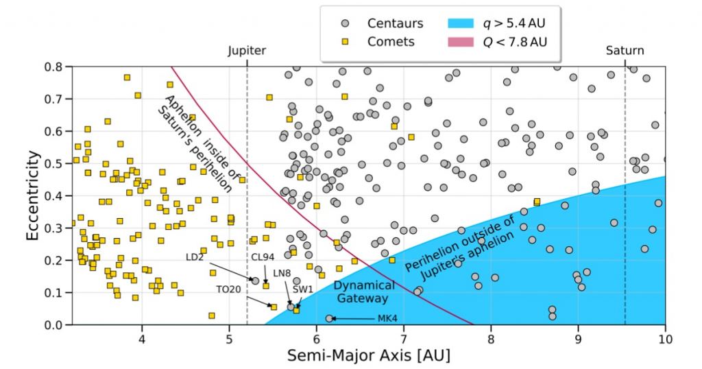 "Centaurs are extremely interesting for many reasons," lead researcher on the study Darryl Seligman (University of Chicago Department of Geophysical Sciences) told *Universe Today*. "I think the most intriguing aspects of this population is that they will show us the missing link in our understanding of the temporal evolution of the minor bodies in the Solar System. The Centaurs in between the giant planets serve as the source population for the Jupiter family comets, which presumably originate out past Neptune."