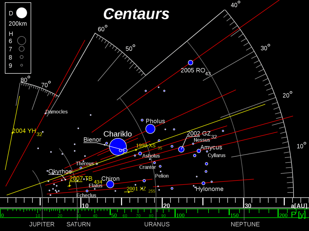2060 Chiron was first Centaur asteroid discovered and recognized as such in 1977, followed by 5145 Pholus in 1992. Today, 452 Centaurs are known of, ranging from the orbit of Jupiter to Neptune. Clearly, these are intriguing transitional objects in their own right, and worthy of study not only as pristine samples of the early primordial solar system, but also as transitional objects between inert icy asteroids and active comets. To get an idea of just how strange Centaurs are, witness the bizarre world of 10199 Chariklo, the only asteroid known to possess a ring system. With orbits crossing those of the main larger planets of the solar system, an object has an average lifespan as a Centaur of only a few million years, which is short, as the multi-billion year history of the solar system goes. And though we haven't visited a Centaur yet per se, we may have gotten a preview of one of these strange objects during flybys of the outer moons of Saturn, and the ice giant worlds of Uranus and Neptune during the Voyager 2 mission.