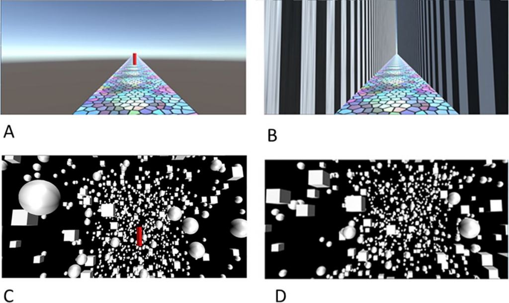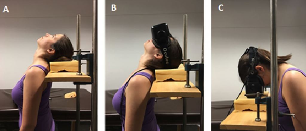 For this study, the researchers had participants use virtual reality headsets and then lie down in a virtual environment that was tilted so that the visual "up" was above their head and not aligned with gravity. The researchers varied the strength of visual orientation cues, using an oriented corridor and a starfield while also varying head-on-trunk orientation and body posture.