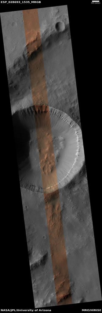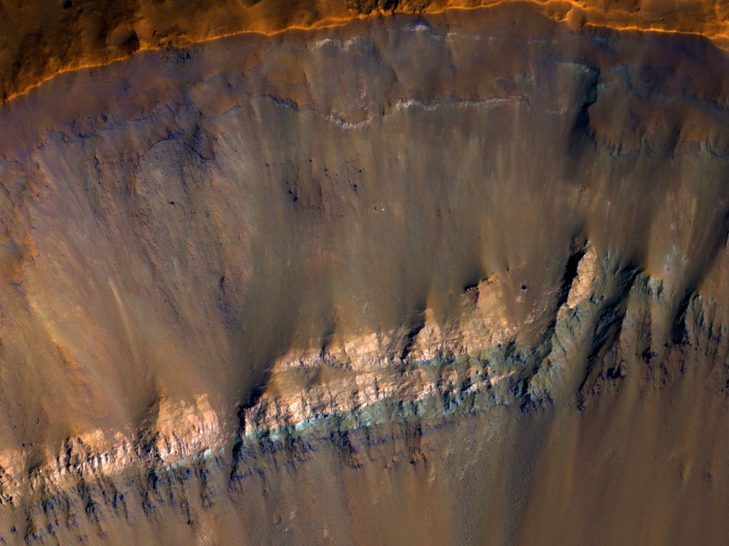 This beautiful image shows the interior of an impact crater in the Hellas Planitia region of Mars – just north of the gigantic Hellas impact basin located in the southern hemisphere of Mars. This nameless crater is about 6 to 7 kilometers wide in total, but this partial image shows about 1 km of width inside the crater wall. Partway down from the crater rim is a prominent bright layer of bedrock.