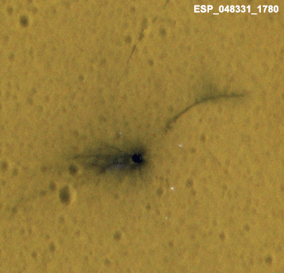This is likely the result of the chute shifting in the wind, which the HiRISE team also observed with the Curiosity rover's own parachute shortly after it landed on the surface. In any event, this updated view of the crash site reminds us that landing exploration vehicles and capsules on Mars is tough, challenging work and there are often unforeseen accidents (aka. the " Mars Curse ").