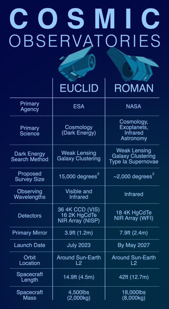 Euclid will rely on optical and infrared instruments to observe an area measuring approximately 15,000 square degrees (about one-third) - much larger than the area observed by Roman. It will peer back 10 billion years, roughly 3 billion years after the Big Bang, when the Universe was expanding much slower than it is today. Meanwhile, Roman will study an area measuring about 2,000 square degrees (one-twentieth of the night sky) but in much greater depth and detail. Using its advanced optical and infrared imaging modes, Roman will visualize what the Universe looked like just 2 billion years after the Big Bang.