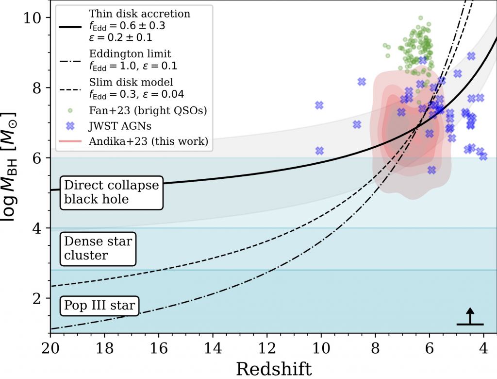 From these surveys, they identified 350 compact galaxies with a redshift greater than z = 6. The light from these galaxies began their journey to Earth when the Universe was less than a billion years old, making them among the earliest galaxies. Of these, 64 of them appeared to have quasars, indicating the presence of an active supermassive black hole. They then compared the luminosity and redshift to determine the age and mass of the black holes. A sample of 64 isn't huge, but it is enough for the team to apply Monte Carlo simulations to determine how the black holes evolved.