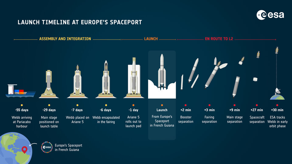 The next Ariane 5 launch is scheduled for no earlier than September, for a set of satellites (the SES-17 and Syracuse-4A satellites), and if successful, can then be followed by the launch for James Webb, likely no earlier than late November. NASA, ESA and Arianespace have not given a projected launch window, and for safety reasons have not divulged exactly when Webb will begin its journey to South America. However, below is a infographic of all the steps necessary for launch to take place: