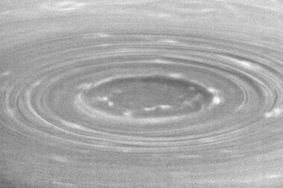This grey-scale image of Saturn's northern polar vortex was captured by the Cassini spacecraft. This image was captured from a distance of about 1.2 million km. A portion of Saturn's rings are barely visible in the top right. Image: NASA/JPL-Caltech/Space Science Institute.[/caption]