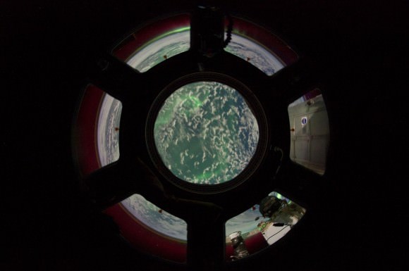 A green tint from an aurora is seen out the Cupola over the southern Indian Ocean. Credit: NASA[/caption]