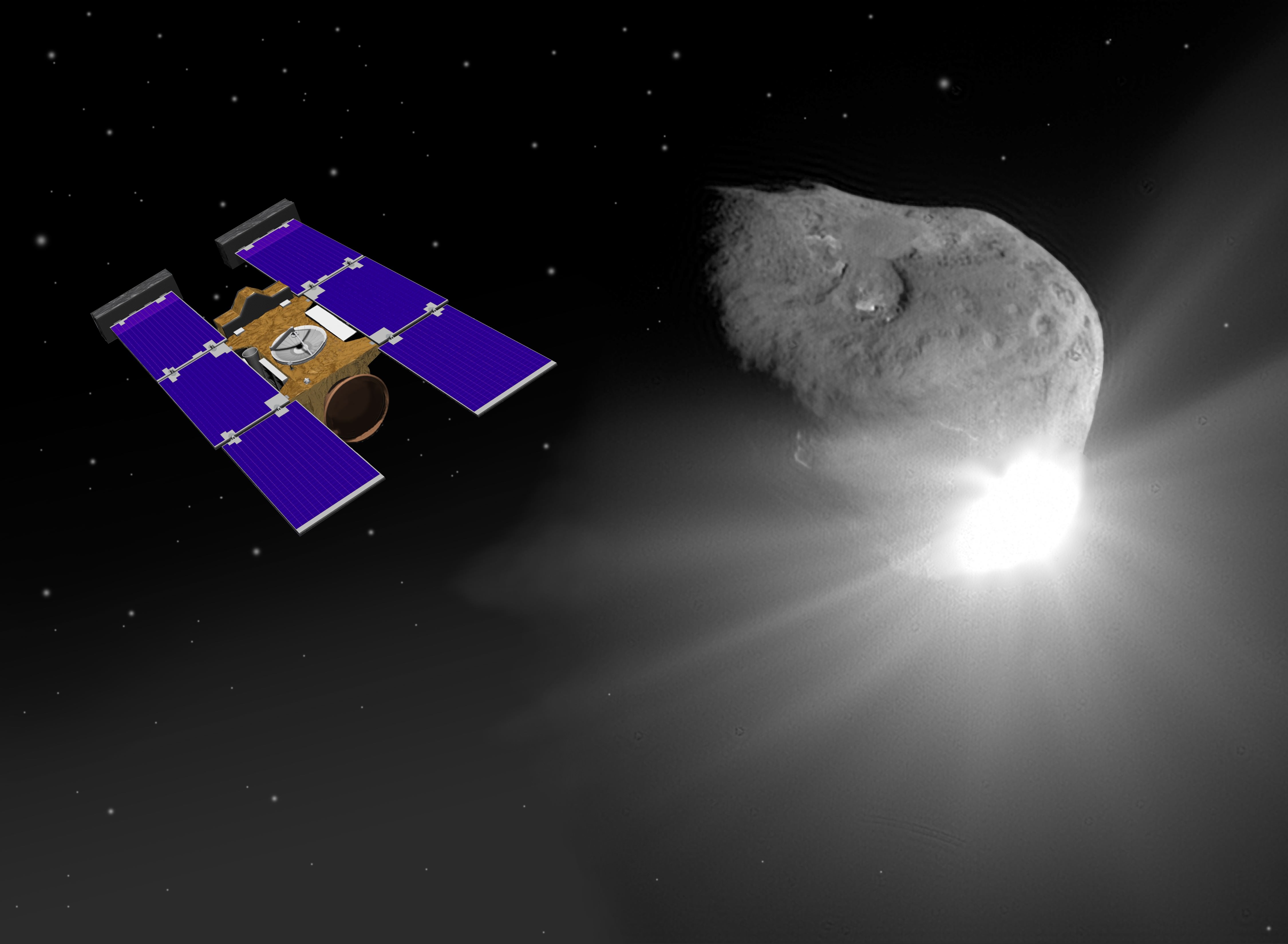 Comet Tempel 1 was first visited by NASA's Deep Impact comet smashing mission in July 2005. Deep Impact delivered a 375 kg projectile into the path of Temple 1 that resulted in a high speed impact directly into the comet nucleus.