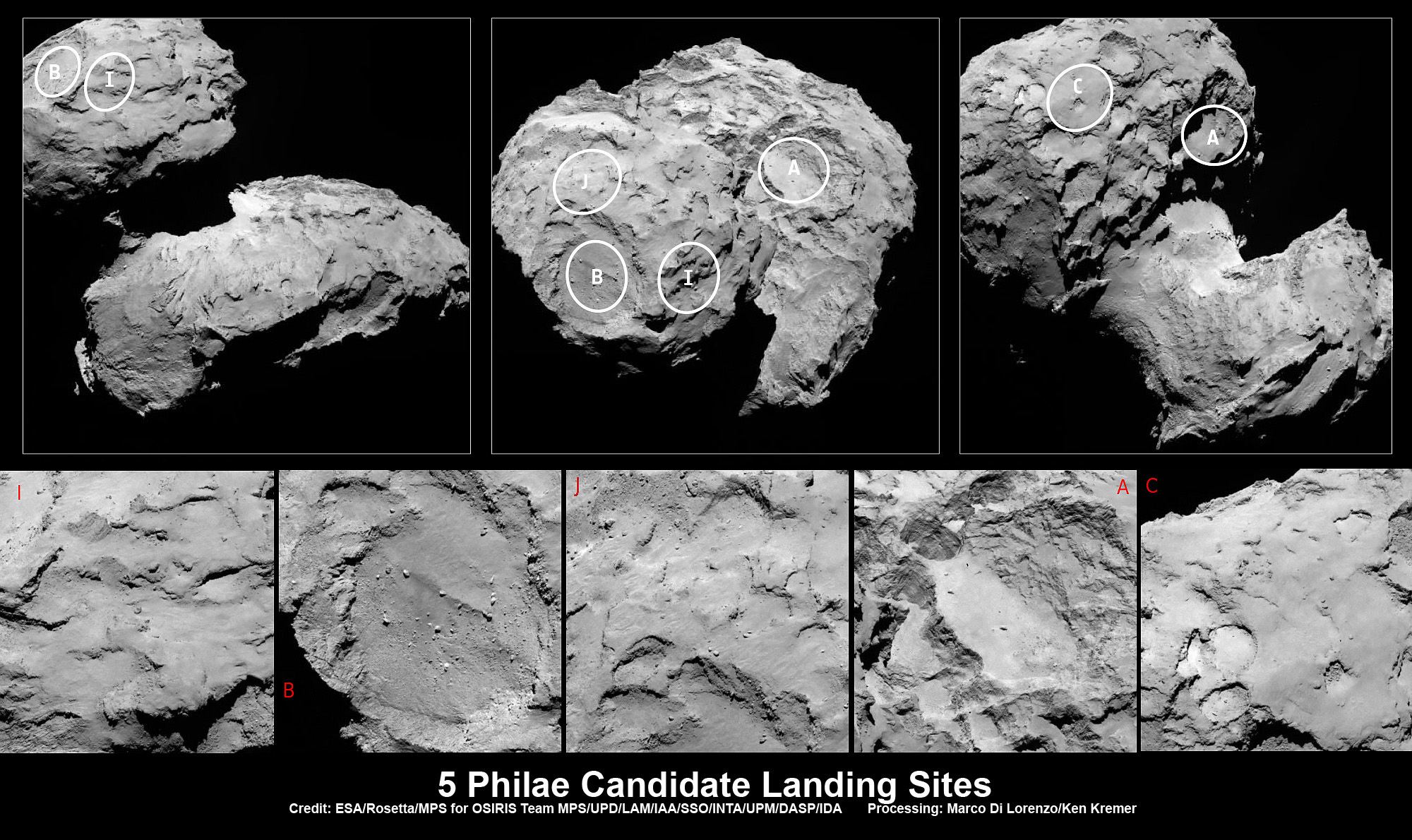 Five candidate sites were identified on Comet 67P/Churyumov-Gerasimenko for Rosetta's Philae lander. The approximate locations of the five regions are marked on these OSIRIS narrow-angle camera images taken on 16 August 2014 from a distance of about 100 km. Enlarged insets below highlight 5 landing zones. Credits: ESA/Rosetta/MPS for OSIRIS Team MPS/UPD/LAM/IAA/SSO/INTA/UPM/DASP/IDA Processing: Marco Di Lorenzo/Ken Kremer Story updated[/caption]