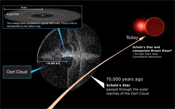 A comparison of the Solar System and its Oort Cloud. 70,000 years ago, Scholz's Star and companion passed along the outer boundaries of our Solar System (Credit: NASA, Michael Osadciw/University of Rochester)[/caption]