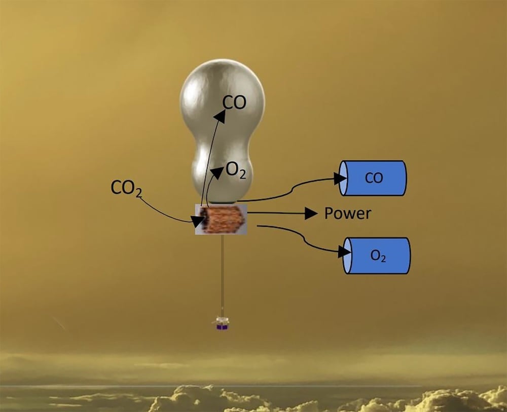 Technology has to be tough to last on Venus, as Fraser explains.There is plenty of carbon dioxide in Venus' upper atmosphere - in fact, that is primarily what the atmosphere there is composed of. Notably, both carbon monoxide and oxygen, the components the SOE process creates, are lighter than the carbon dioxide they're created from. In other words, in Venus' atmosphere, the outputs of the SOE process are buoyant.