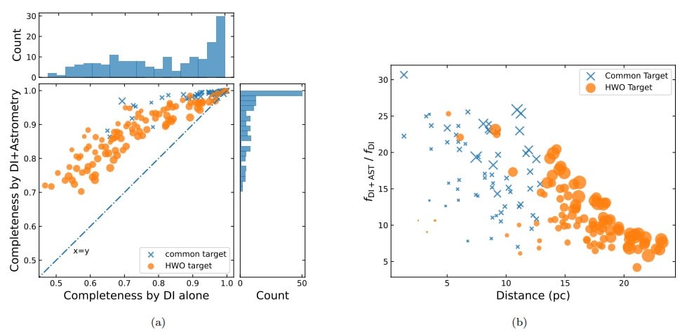 *This figure shows the overall completeness of every target in the left panel. The bottom-left sub-panel compares completeness by direct imaging alone (x-axis) with imaging+astrometry (y-axis). The top-left and bottom-right sub-panels give histograms of completeness in the two scenarios. The right panel shows the comparison of the benefit-to-cost ratio by imaging alone and imaging with astrometry. The orange points and blue crosses indicate targets for HWO only and common targets for HWO and CHES, respectively. The size of the points represents the distance from the center of the habitable zone. Image Credit: Bao et al. 2025*