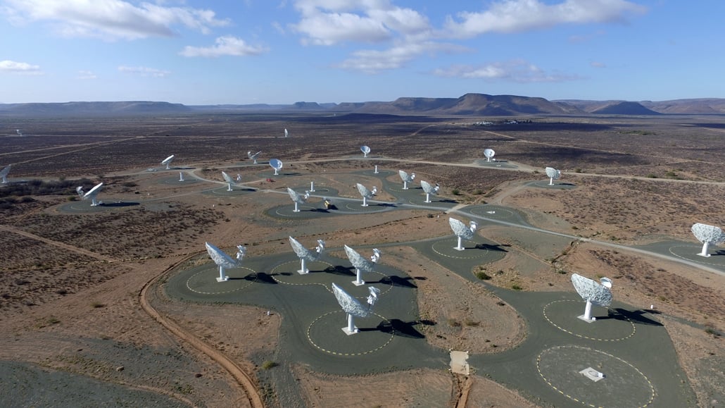 Aerial image of the South African MeerKAT radio telescope in the Karoo, South Africa. Credit: SKA