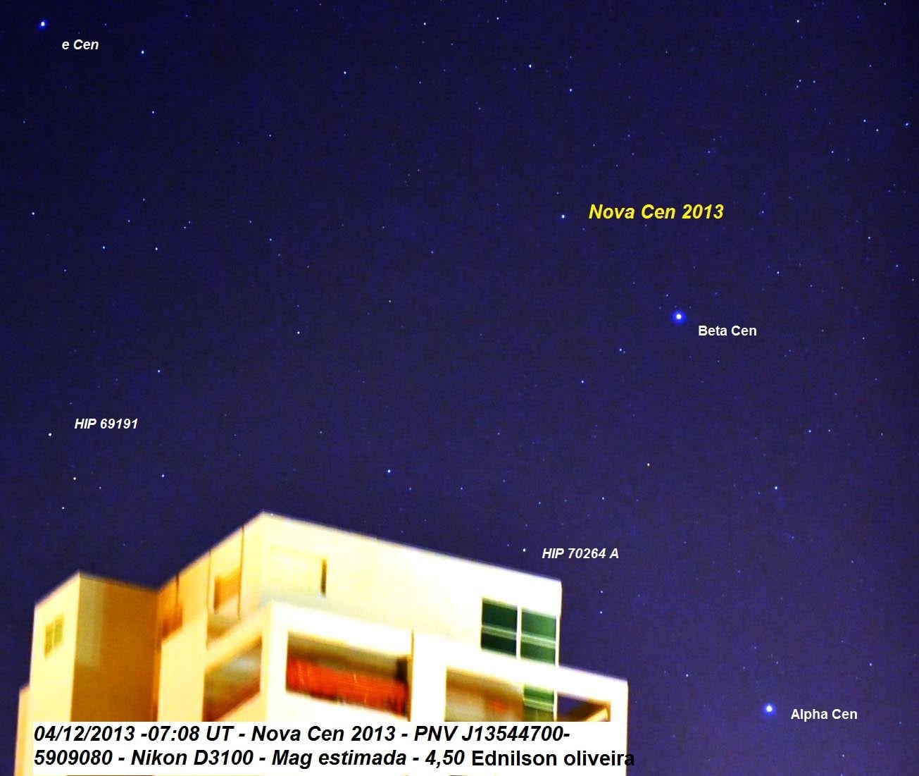 The initial discovery of Nova Centauri 2013 (Nova Cen 2013) was made by observer John Seach based out of Chatsworth Island in New South Wales Australia. The preliminary discovery magnitude for Nova Cen 2013 was magnitude +5.5, just above naked eye visibility from a good dark sky site. Estimates by observers over the past 24 hours place Nova Cen 2013 between magnitudes +4 and +5 "with a bullet," meaning this one may get brighter still as the week progresses.