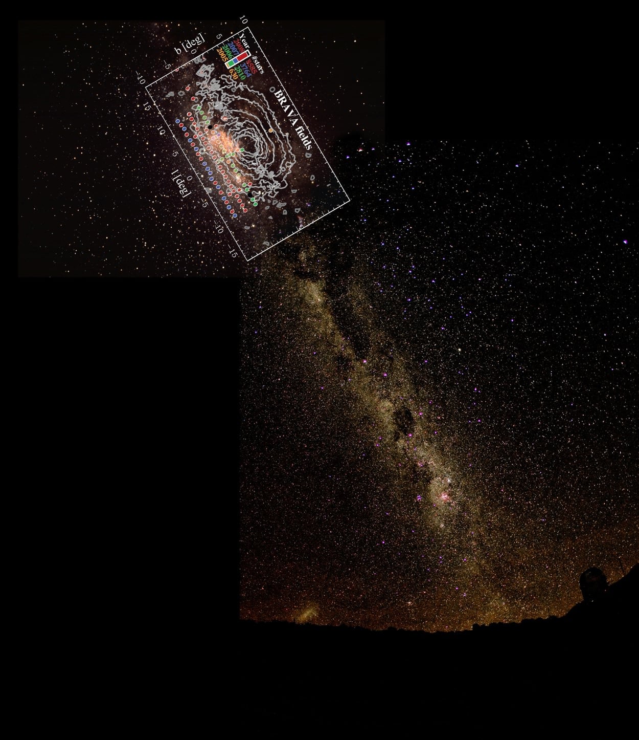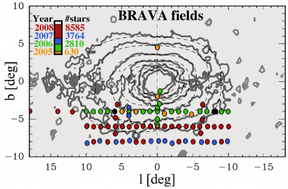 The BRAVA team found that stars closest to the plane of the Milky Way Galaxy have fewer "metals" than stars further from its galactic plane. The team's conclusion does confirm standard views of stellar formation, yet the BRAVA data covers a significant area of the galactic bulge that can be chemically analyzed. If researchers map the metal content of stars throughout the Milky Way, a clear picture of stellar formation and evolution emerges, similar to how mapping CO