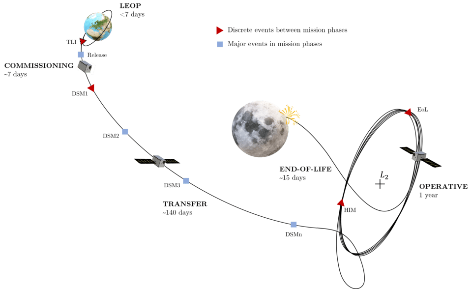 Depiction of LUMIO's orbital path to the L2 Earth-Moon point.