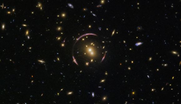 Hubble image of SDSSJ0146-0929, a galaxy cluster that is massive enough to severely distort the spacetime around it. There's the mass of the visible stars and gas in each galaxy member. However, there's also a hidden amount of dark matter that adds to the cluster's mass. Credit: ESA/Hubble & NASA; Acknowledgment: Judy Schmidt