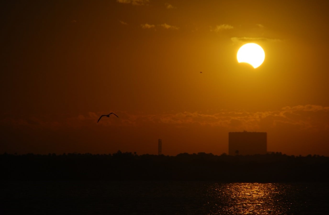 A partial solar eclipse rising over the Vehicle Assembly Building along the Florida Space Coast. Credit: Dave Dickinson[/caption]