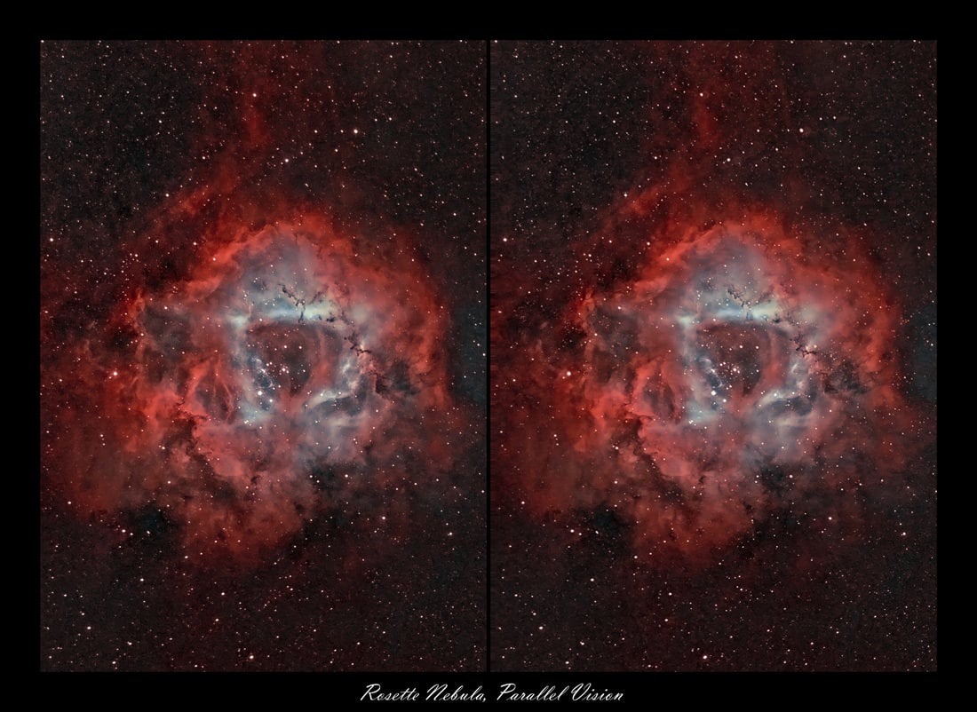 Would look twice as sweet! Are you seeing double? No. This isn't an eye test - rather an incredible, dimensional look at NGC 2244 - a star cluster embroiled in a reflection nebula spanning 55 light-years and most commonly called "The Rosette." Step inside and prepare to be blown away...